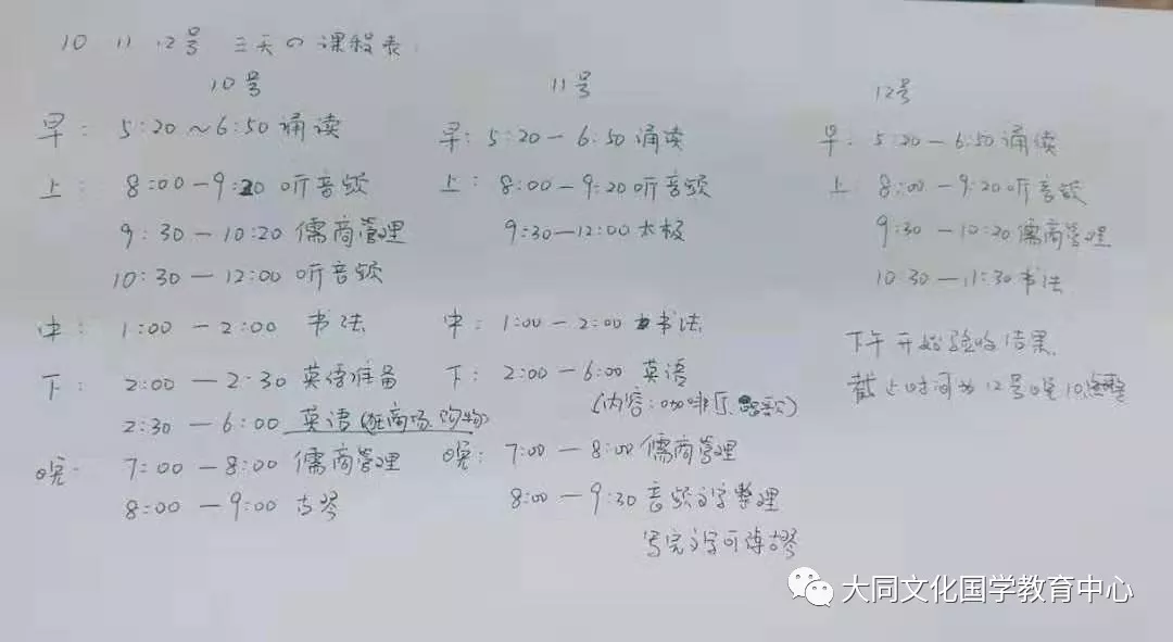 时间飞逝,四天时间一晃而过,三天学习时间即将到来,当班主任老师突然告知孩子们假期还可以再延长一天的时候,所有孩子的头都摇的像拨浪鼓一样,理由是太久不学习,太空虚,从未见过孩子们的这般修学态度,在三天的学习时间里,我们看到了孩子们的真正生命状态:积极而又努力,担当而又自信;阳光不失稳重,专注而又不失大局。本要一周完成的经典背诵内容,孩子们两个晨读时间就完成了;本应该在两三个月前就应该纠正的古琴指法错误,五分钟的古琴课考核就纠正了;以往一页硬笔书法都要张老师评改并纠正多次,现在基本都能一次性通过;以往一个月都学不会或者学不好的太极拳和太极剑,现在两天的课上课下都能打的有模有样;之前从来都不愿意或者不能张口说英语的,现在都能积极参与口语场景的演练和表达;之前都说儒商管理听不懂或者听不明白的,现在也都能登台进行十五分钟复讲了。