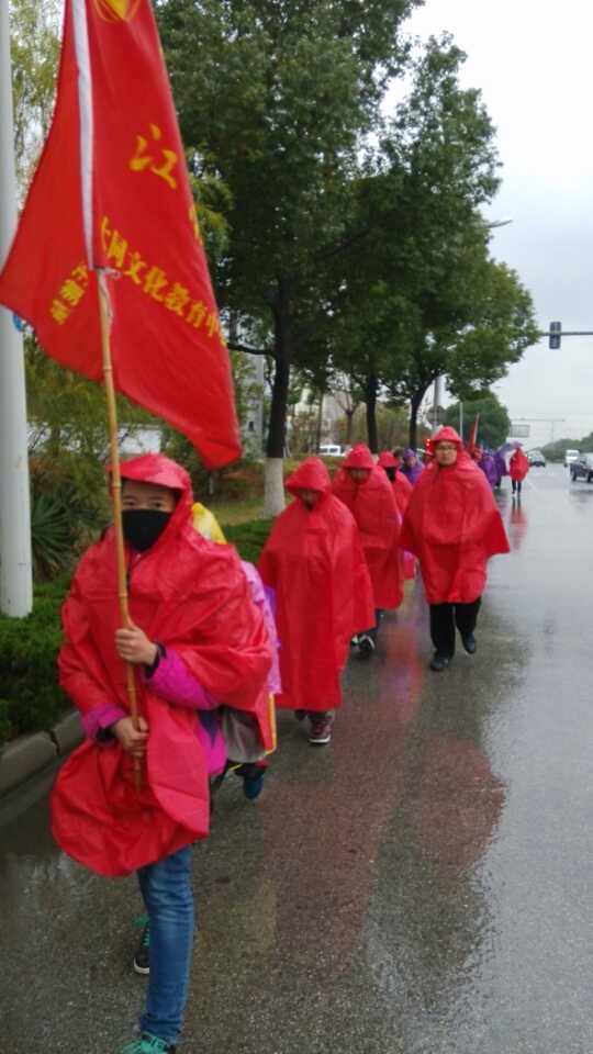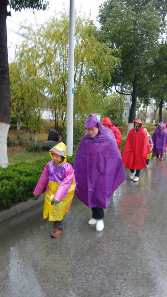 风雨吴江路。雨不大,但愈来愈紧,愈密集。孩子们很坚强,雨水在脸上流淌,湿了裤子、湿了鞋子,寒冷、风雨阻挡不了前进的脚步!一个个移动的红雨披成为风雨中最动人的风景!感谢天公作美成就我們,感谢风和雨,感谢王老师杜老師,感谢江南宾館,感谢自己,感谢一路陪伴我们的别克车,感谢中石化…哈哈