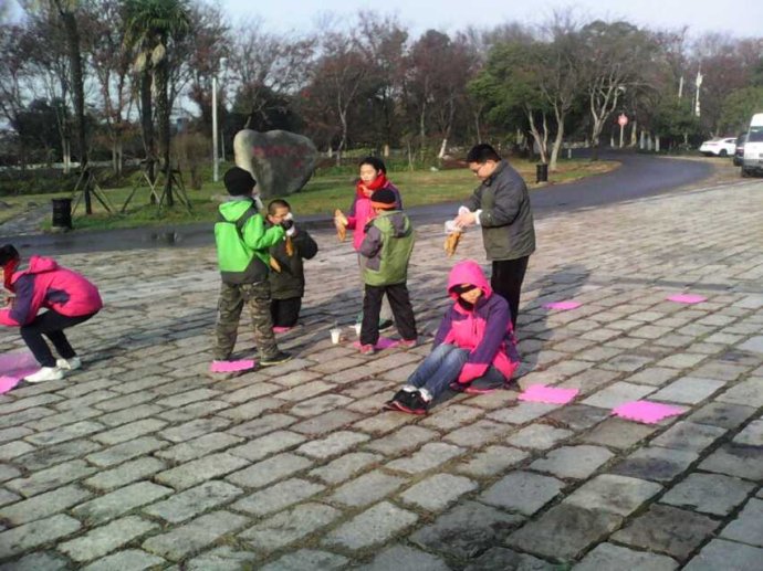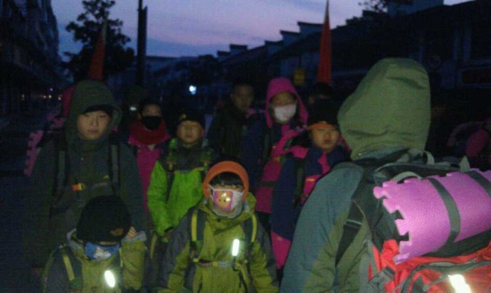 雨过天阴,寒风中继续前进。一个孩子不慎滑倒了,在大家帮助下艰难的站起来,抹一把脸上的雨水,更坚定的往前走……