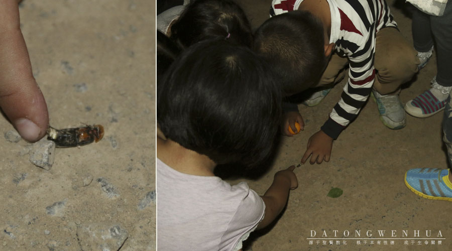 孩子们很好奇,任老师们就给他们抓了一个,看看萤火虫到底是什么样子。