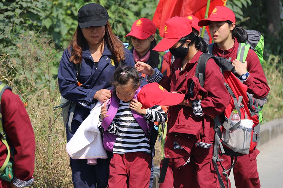 谢天屹(组长 16岁):这几天,我感觉比起脚更累的是心。我是第一次当组长,觉得在很多方面都做得不到位。我们组的每一位同学都非常棒。特别是两位小同学,薛丁瑜非常坚强,他能够坚持走下去, 即使累到掉眼泪,我十分敬佩他;还有张浩然,也非常努力。我会继续努力做好组长。