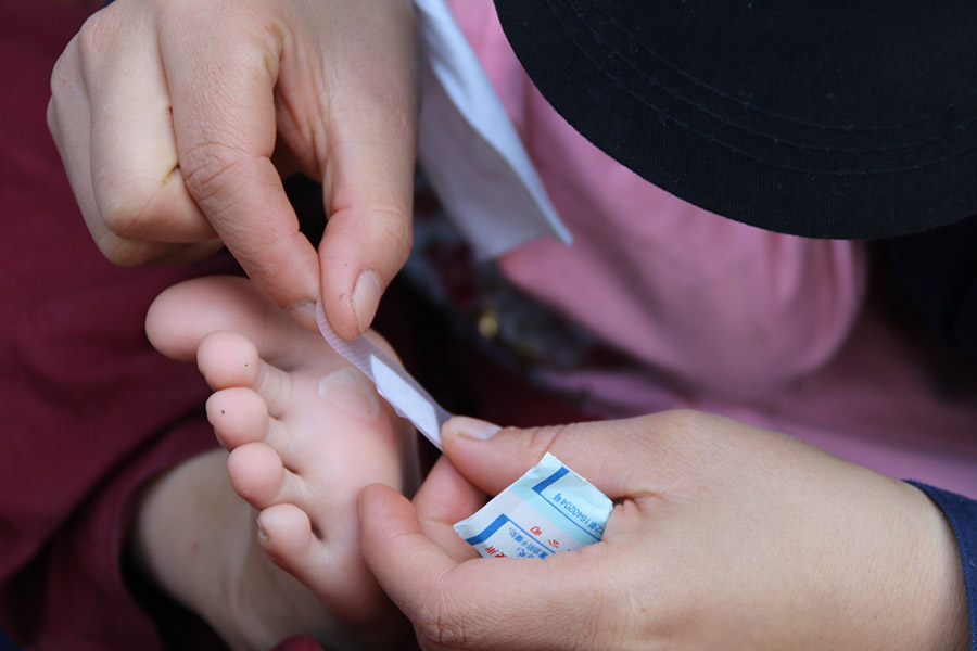 杨至璁(7岁):走路磨肩膀,而且感觉越来越累。