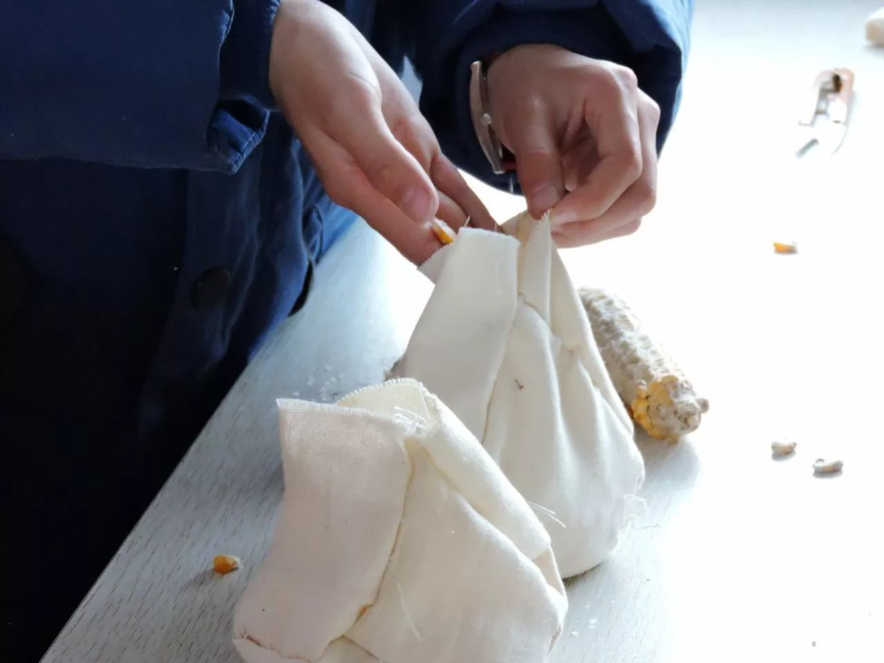 “朱帥有,你縫錯了,沙包的4個邊已經夠了,你看這塊布是底。”