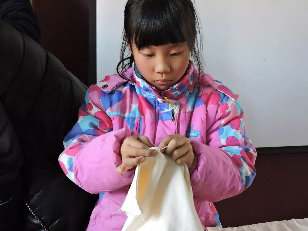針、線、頂針、剪刀每人一份,紛紛發給大家。穿線,打結,縫布,小孩子們有模有樣。