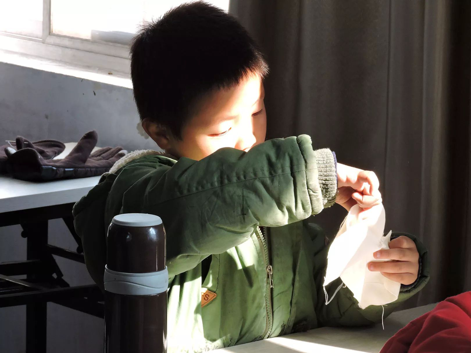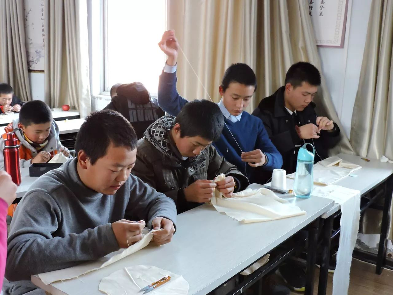 三年前,第一次來大同,那是一个冬日的傍晚,因為初來山上無所事事,被莫名其妙拉到一間大教室,推門的瞬間才被告知,英才班的大孩子和所有老師都在這裏手工做自己的棉被被罩,屋子裏的溫暖和靜谧讓我不由自主地坐下,拿起針線,開始了做活,一切是那麽的自然舒適。後門坐著一位老師,娴熟地踩踏著縫紉機,吱吱吱吱···偶爾有說笑的聲音,偶爾有哼唱的聲音,記憶中的趙老師,招呼我隨便坐,“隨便縫,隨便玩”,隨之一笑,親切而慈愛······而今,因為機緣,又伴著針線來到這間教室,雖然人不盡相同,多了老師,少了學生,少了學生,多了老師,不禁想起趙老師的一段話: